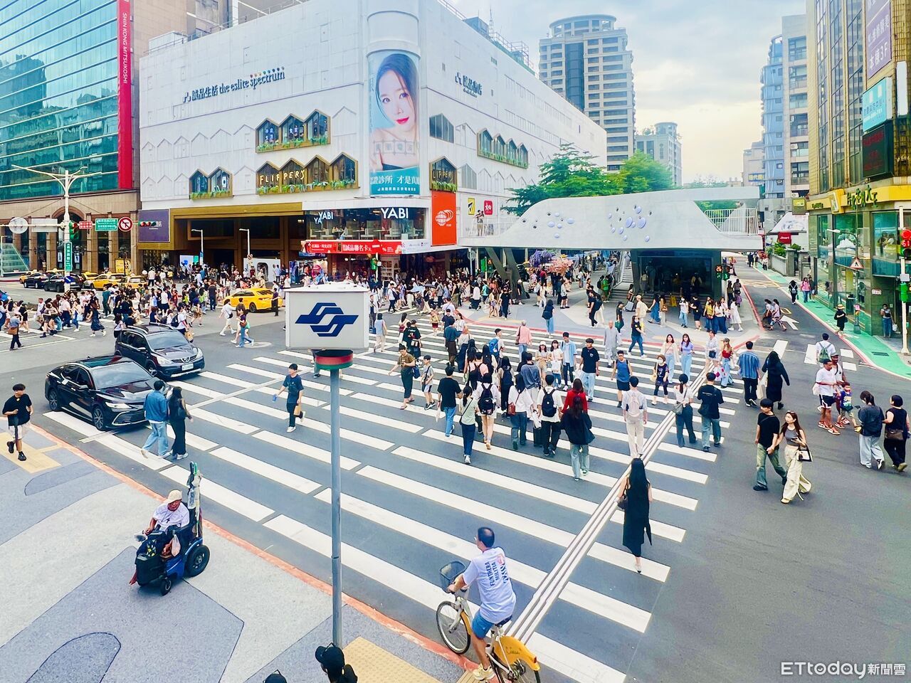 ▲中山站線型公園完工後翻新樣貌,超大斑馬線設計讓人聯想到日本澀谷熱鬧街頭氛圍,成為城市新地標 。(圖/記者王威智攝)