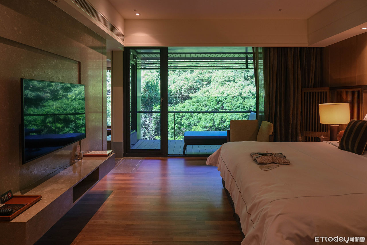 基礎的雅緻豪華客房就有15坪大,規劃小沙發和餐桌,上方擺放迎賓水果;獨立陽台、冷熱雙湯池、雙洗手台、分離式衛浴和TOTO免治馬桶應有盡有,沿床鋪、雙湯池、衛浴剛好可以繞一圈。值得一提的是,每房都擁有落地玻璃窗,走到戶外陽台,躺坐在貴妃椅上,眺望無限綠意,在大自然的懷抱下盡情放空、翻書,享受度假感滿分的小旅行。