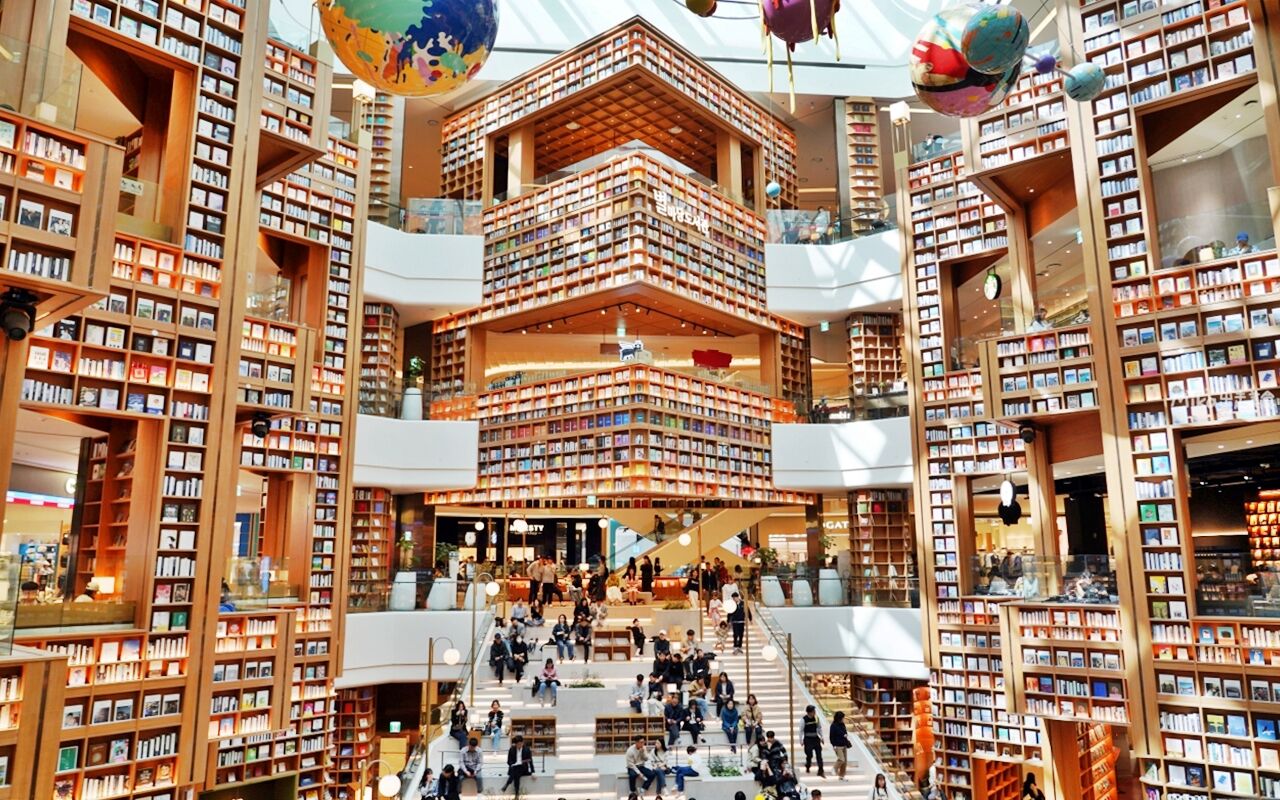 除了江南COEX MALL裡的星空圖書館,位於水原Starfield購物中心4到7樓,還有另一座2024年1月才開幕的2.0升級版星空圖書館,同樣也很值得朝聖。這裡有挑高13公尺的巨型落地式設計網美書櫃牆,共7萬多本藏書。陽光透過開放式玻璃穹頂灑落,半空中彩色星球更是襯得星光點點,真的很壯觀。