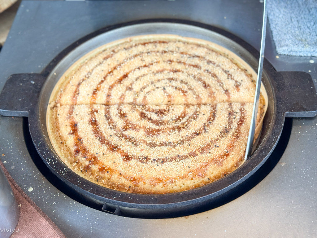 採開放式攤位設計,遊客可直接看到製作過程,麵糰在鐵板上旋轉成型,餡料均勻鋪撒,光是看製作過程就很療癒。一鍋切成四片,麥煎餅的價格比起一般的高,但份量很扎實,不定時還會推出新口味。