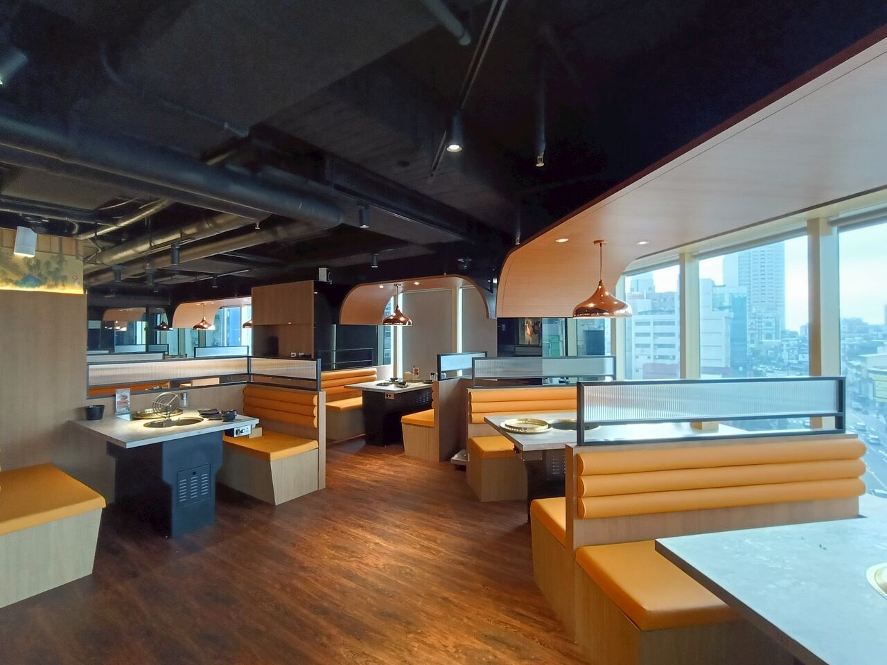 客人一律先到七樓報到,接著工作人員就會依序帶客人前往,如果是去饗燒肉亭就會走到樓上八樓,如果是去本燔壽喜燒就會走到樓下六樓,七樓這邊算是等候區,除了有廁所之外也有座位,還有飲品可以先飲用,非常貼心。我覺得這樣的設計很好,等於是把整個八樓的空間都展現給客人。裝潢很美,非常像日式懷舊咖啡廳,靠窗的桌邊採光非常明亮,也有高樓景觀可以看。
