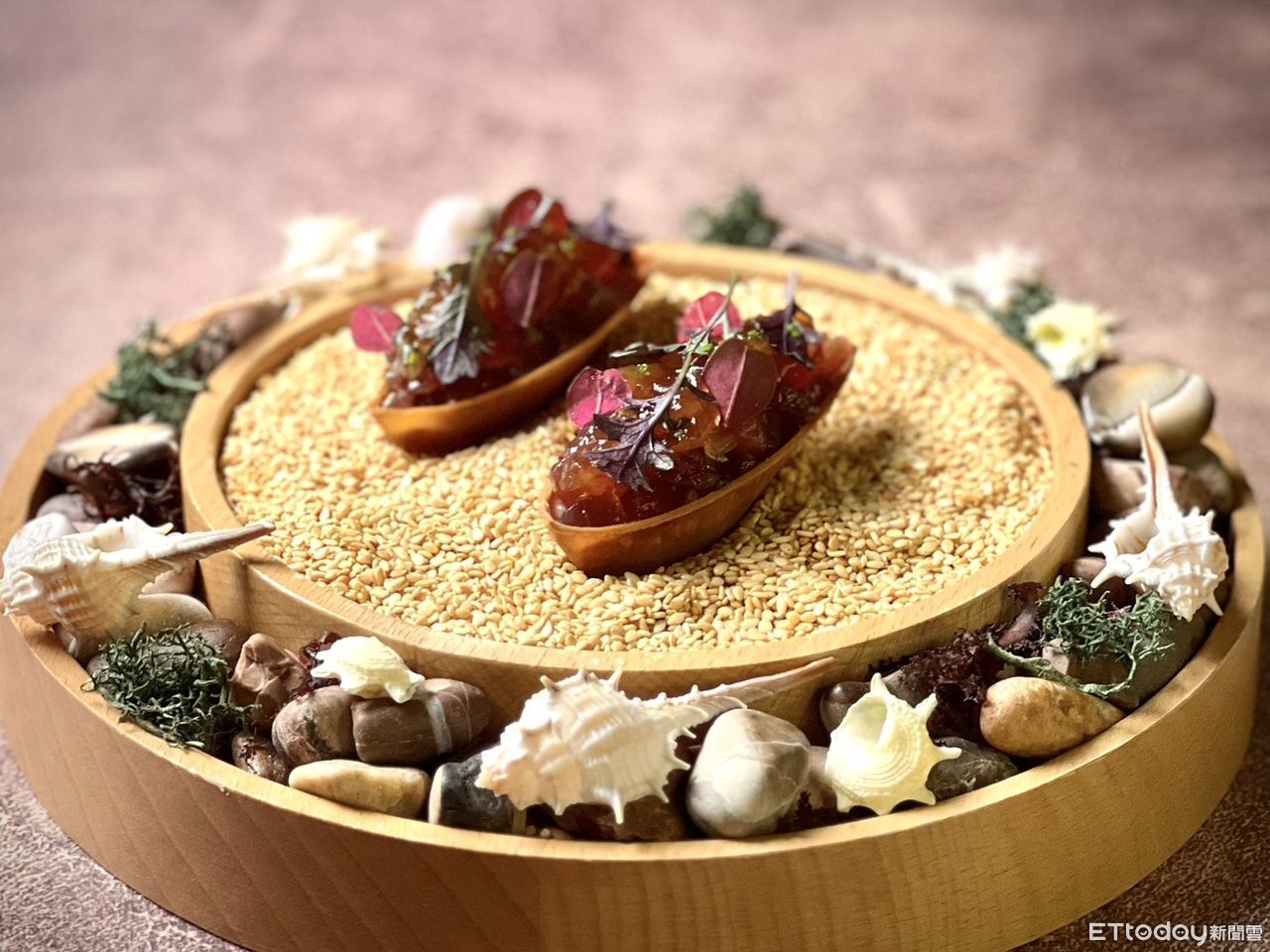▲方蒔夏季菜色「風至漁洄-生澎湖鰹魚、澎湖紫菜、柴魚、馬蜂橙」。(圖/方蒔提供)