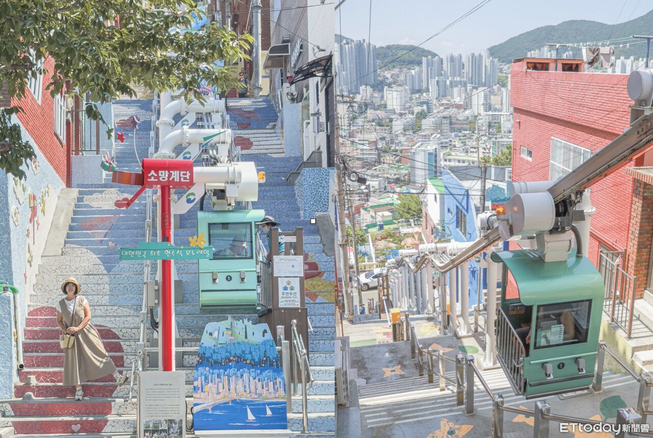 釜山不只有如糖果盒子般可愛的天空膠囊列車,距離釜山站約10分鐘車程的「希望階梯單軌列車(Stairs of Wishes)」,就是一處小巧且療癒的免費景點。旅客可以搭著電車緩慢登頂俯瞰釜山山城,沿途可愛的彩繪階梯也超好拍。