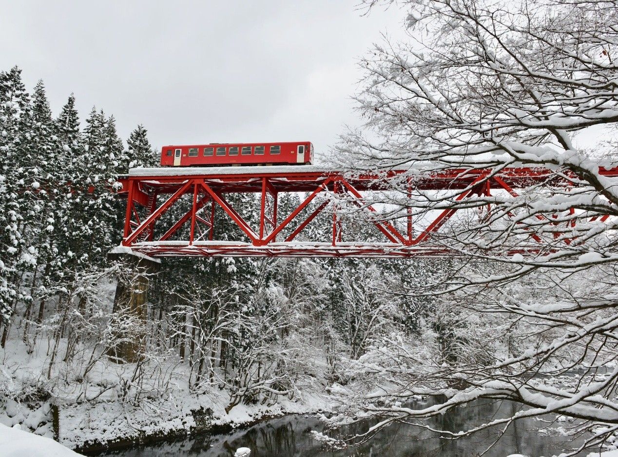 從山岳轉往田園,搭上被暱稱為「秋田美人線」的秋田內陸縱貫鐵道,隨列車緩緩穿越覆雪山谷與靜謐村落,沿途溪谷、鐵橋與農田景致如畫,宛如宮崎駿筆下場景,是日本最美的雪景鐵道之一。