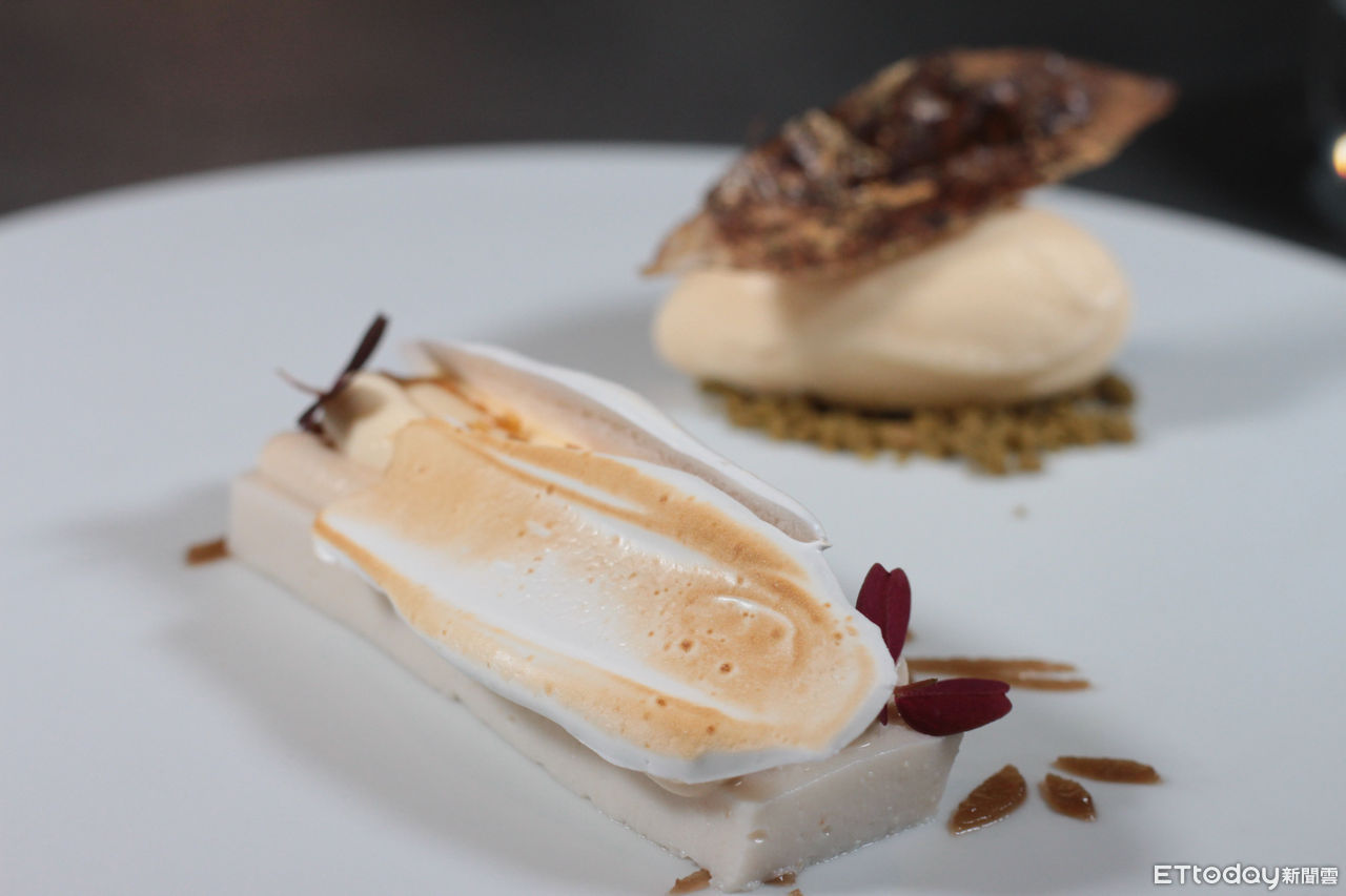 ▲「鴨肝|紅棗|白蘑菇」。鴨肝改用米麴和清酒將其醃漬2天,使其散發細膩米香。(圖/記者黃士原攝)
