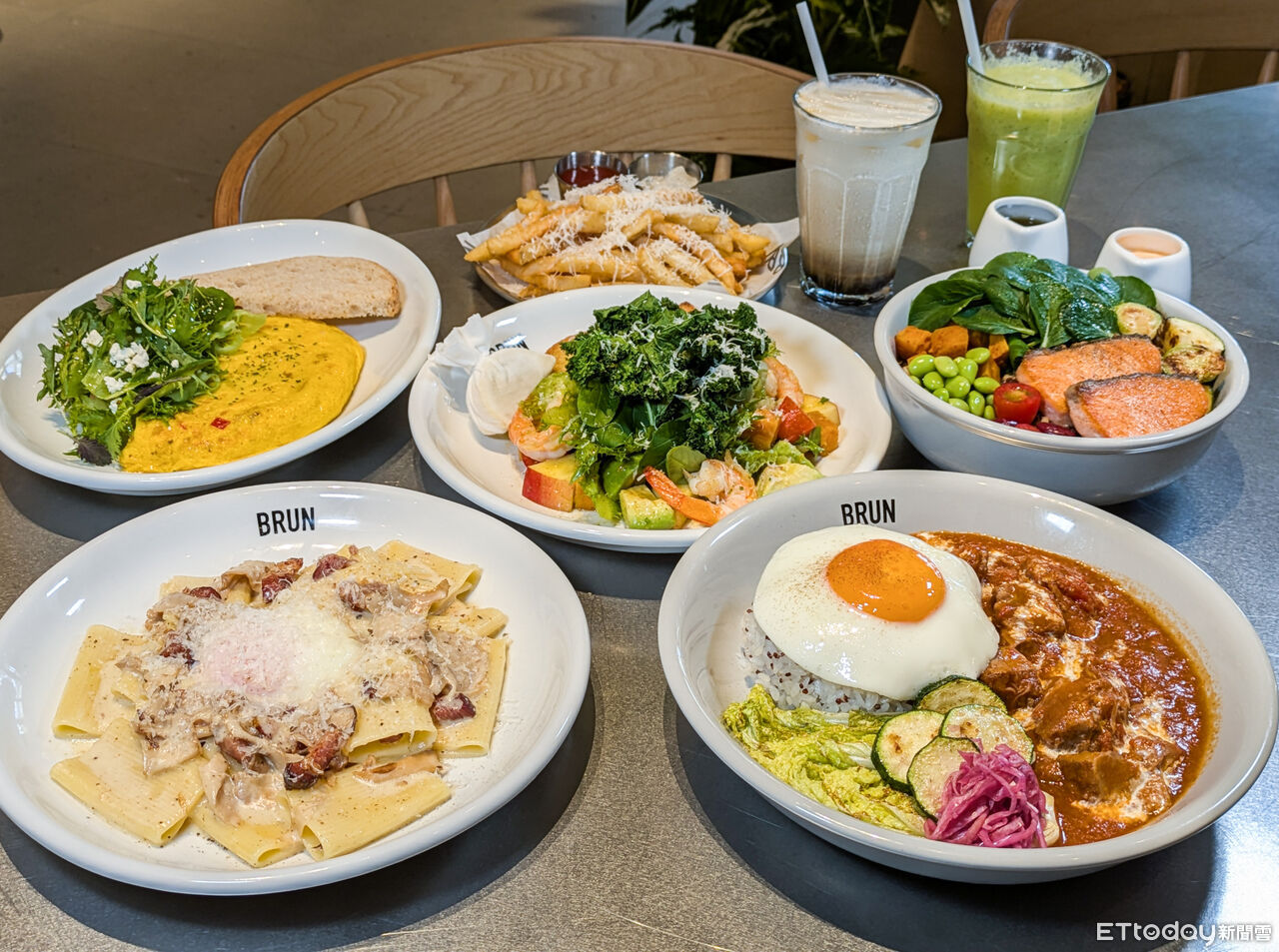 BRUN不然提供全天候供應早午餐,像是含有超過10種蔬菜的酪梨蔬菜碗、可以一次品嚐到燻鮭魚與火腿搭配的經典班尼迪克蛋、由羅勒油與羊乳酪堆疊出口感豐富的炒蛋、龍蝦高湯慢燉的蝦肉燉菜濃汁炊飯,板橋店也搶先推出2道菜色,分別是煎鮭魚蔬菜沙拉碗、季節綠葉沙拉搭鮮蝦酪梨。