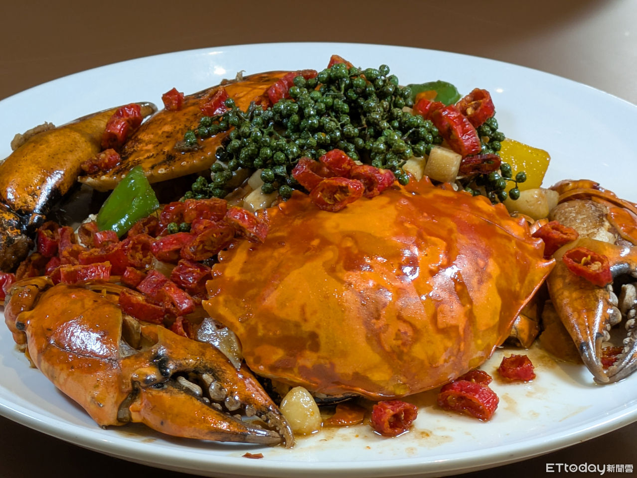 「鮮麻爆炒沙公」選用重達一公斤以上、肉質厚實鮮美的沙公,先斬件後過油;另起鍋放入蒜、薑、鮮花椒、乾辣椒炒香,再續入前述的沙公拌炒,並以糖、蠔油、生抽、花椒油調味,鹹鮮噴香,微微的麻辣更襯蟹肉香甜。