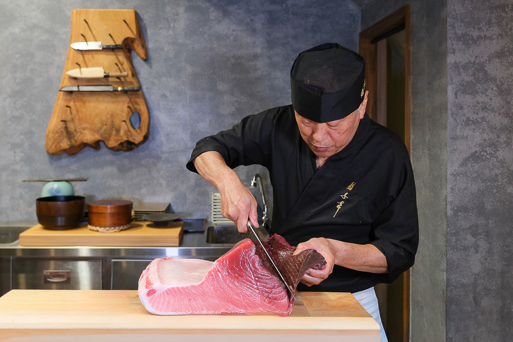 佐山智紹先生是正統江戶前壽司職人,從業逾50年,早年於銀座「壽司間八」當學徒,38歲時於東京葛飾區創立「壽司花勘」,至今已逾30年,並於2015年日本世界壽司大賽榮獲第三名。鮨千本主理人賴政邦先生當年赴日學習時,特地前往東京鑽研江戶前壽司,並結識佐山智紹先生,最終兩人攜手合作創立「鮨千本」。店名則源自賴政邦在京都求學時居住的「千本通」地區,藉此紀念學習歲月。