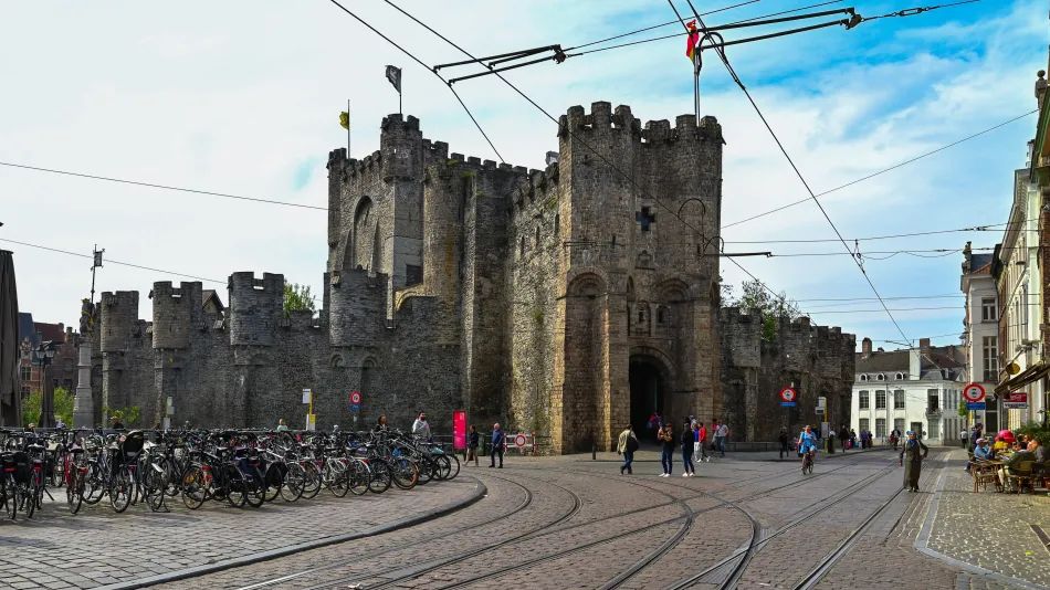 城堡位於根特舊城區北側,地處利斯河與Lieve河匯流處,天然地勢讓它成為控制河運、易守難攻的要塞。城堡旁就是根特重要的廣場Sint-Veerleplein,名稱來自曾矗立於此的教堂,歷史上更因城堡曾作為行政中心,而成為公開刑場。廣場另一個地標是舊魚市場,如今已改建為遊客中心,不需特地造訪,路過時可在入口處欣賞海神波賽頓雕像。若想捕捉城堡最美的全景,推薦到一旁的河道拍攝,運氣好的話還能拍到水中倒影。