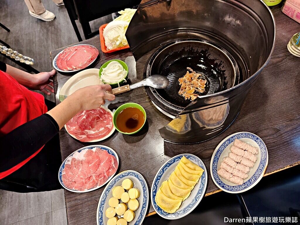 炒完肉片會將炒到半熟肉片取出,然後會把火鍋料加進去石頭火鍋裡面,建議想要後面才加的火鍋食材,記得要先跟店家說,不然基本上都會通通先放進去。
