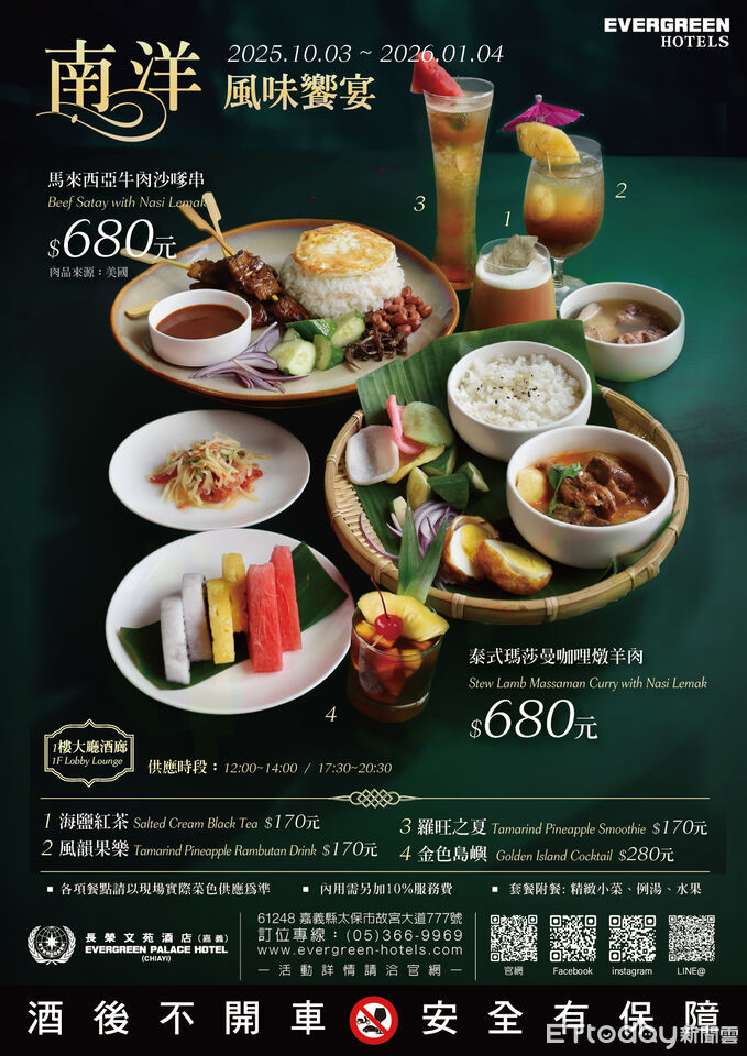 大廳酒廊亦推出雙人南洋下午茶組(920元+10%),鹹點與甜點各三款,搭配特製飲品,營造悠閒愜意的南洋風時光。另有限定鍋物「叻沙鍋」與「肉骨茶鍋」,以及限定套餐「馬來西亞牛肉沙嗲串」與「泰式瑪莎曼咖哩燉羊肉」,一烤一燉,風味層次豐富,盡情暢饗正宗南洋滋味。