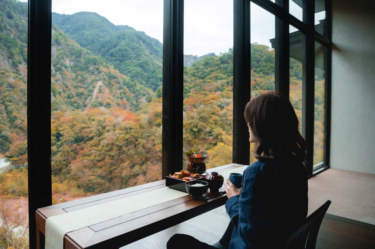 清晨於客房享用以蒔繪漆器盛裝的山林早餐,當季食材搭配器物光澤,映照晨霧山景,感受一場味覺與視覺的靜謐饗宴。