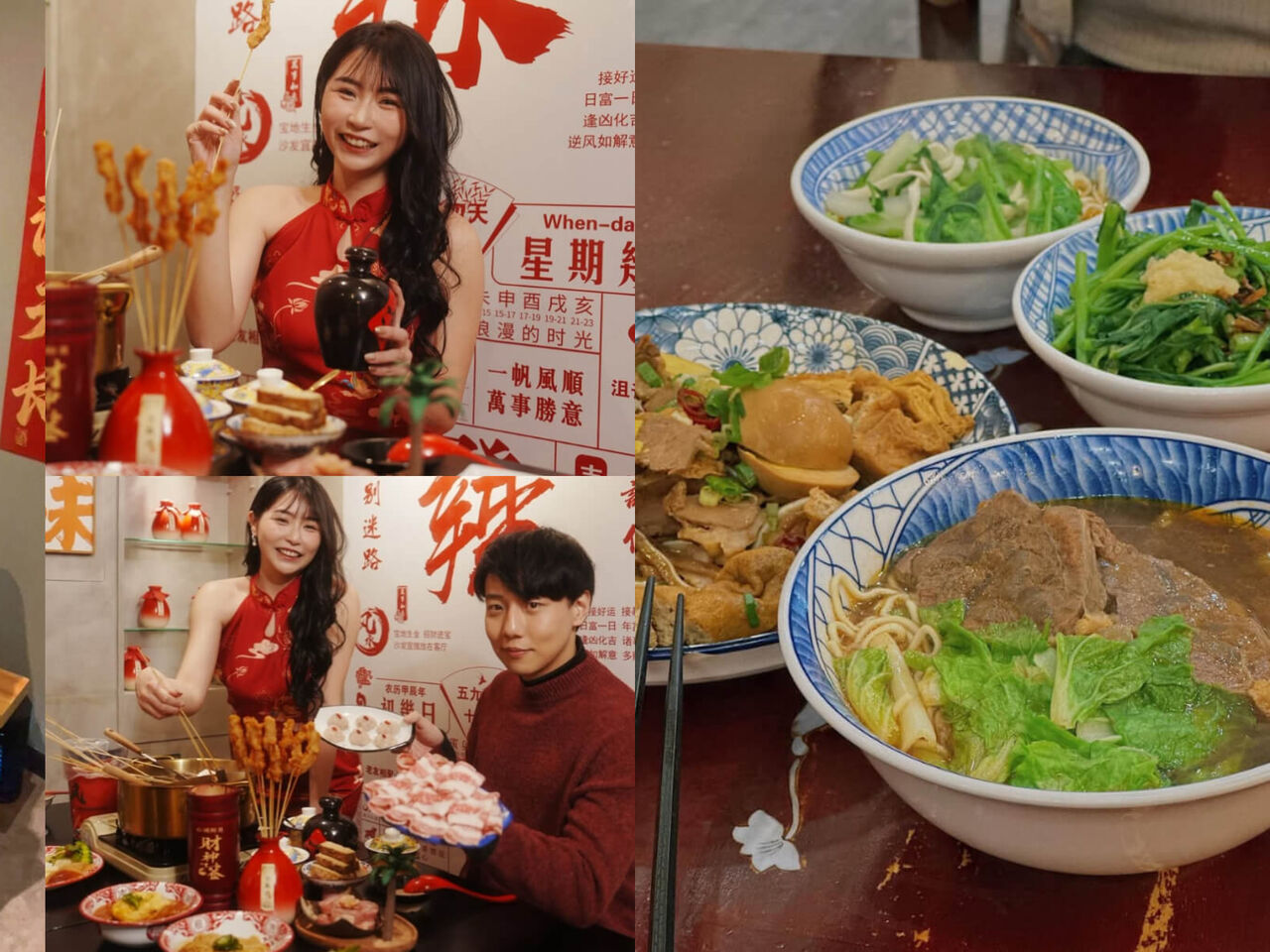 台北最有梗的宵夜「聚面」,來自四川最傳統的川味麵食與串串香火鍋,麻辣鮮香超地道!從門面、裝潢、擺設到餐具,全是濃濃的中國復古風,客棧桌椅、大紅燈籠、牆上的題字,真的是太吸睛了。麻辣串串是採取自助式拿串,食材多元。
