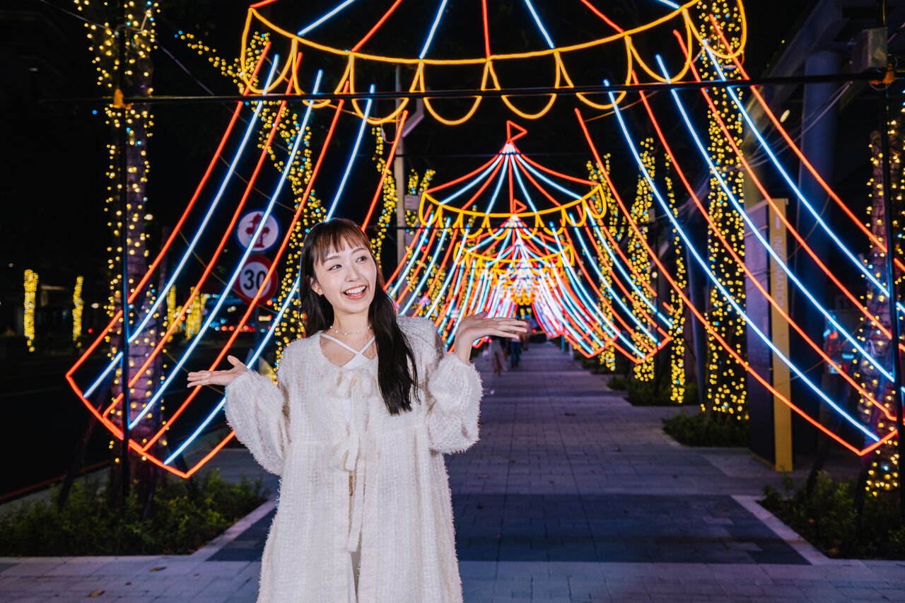 除了主燈秀、繽紛裝置令人期待,7條連通天橋皆已換上新裝。小遠百天橋化身「華麗空中飛人」,以金黃燈海鋪展壯闊舞台,光影化作飛人姿態於空中穿梭,展現動感與驚奇;百揚大樓天橋上則可見「極限火圈表演」,重現馬戲團熱力奔放的獅子穿越火圈的瞬間。