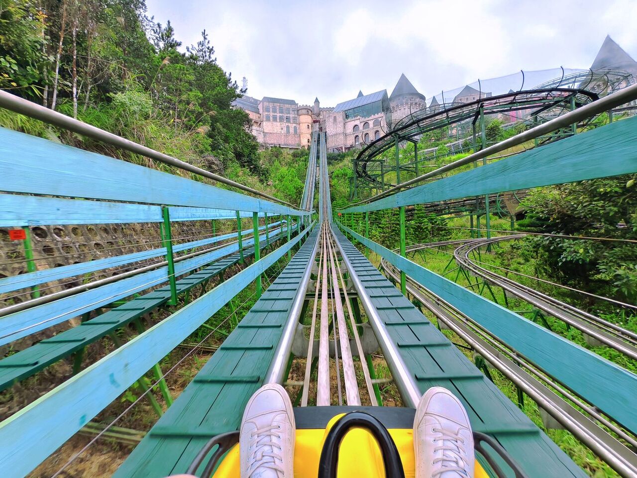 巴拿山另一個超人氣的刺激設施,就是能親自操控速度的高山過山車,這項遊樂設施結合山林地形,蜿蜒穿梭在雲霧與森林之間,被譽為最美的山中雲端過山車。如果沒有線上加購也可以現場買票,可刷卡或付現,依照玩的次數,分別是1次7萬越南盾(約台幣81元)、2次13萬越南盾(約台幣150元)、3次18萬越南盾(約台幣208元)、6次30萬越南盾(約台幣348元),我們這次因為趕時間只玩一次,但因為過山車設有兩條路線,建議可以買2次,一次玩完全部路線。