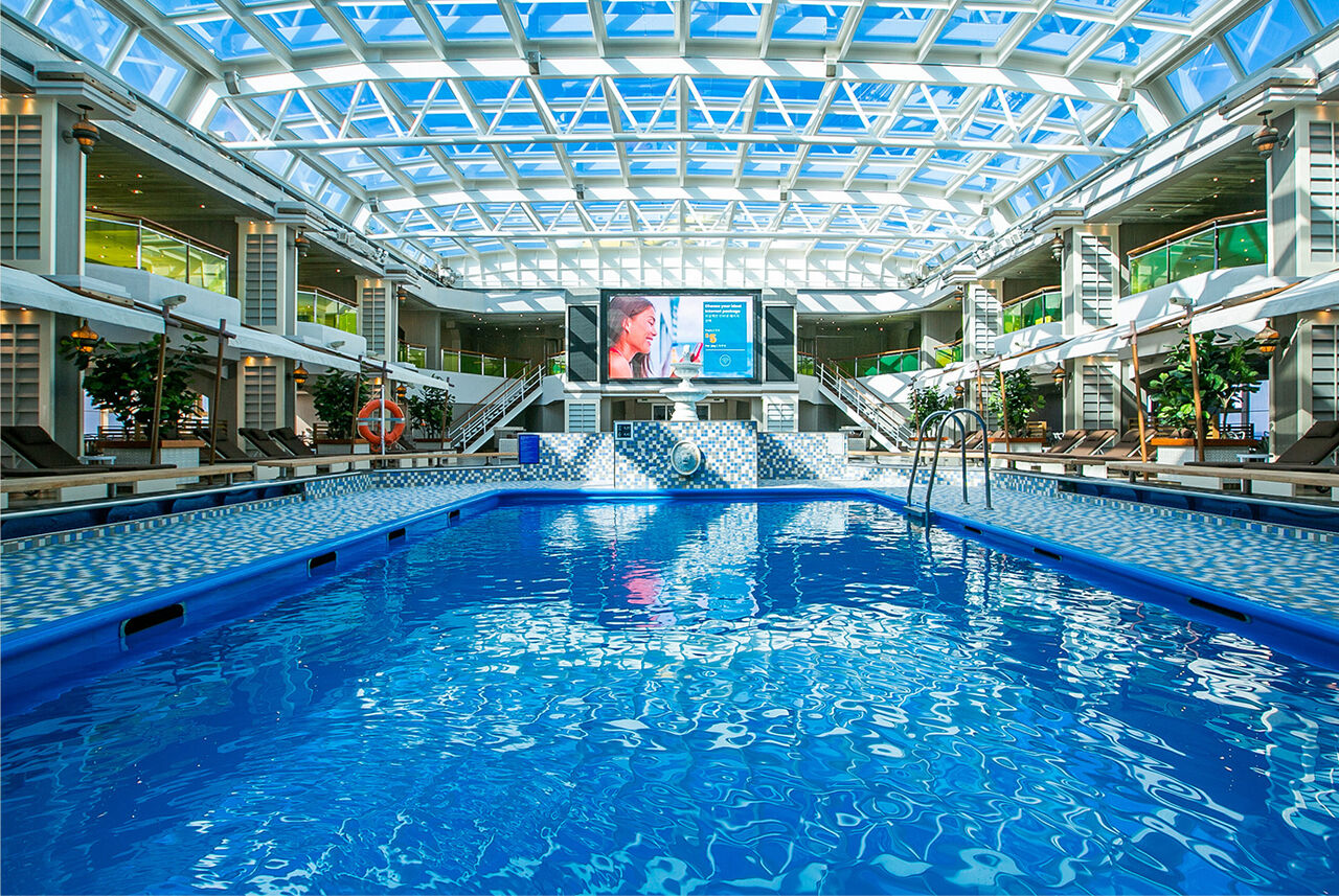 莎倫娜號採用恆久建築風格、鮮明色調、幾何圖案與互動燈光,塑造當代空間美感。中央迎賓大廳「萬神殿」挑高十層,延續神話主題,天幕懸掛發光3D 列印雲朵裝置,搭配光影音效,打造沉浸式的古希臘意象,帶來極致視聽體驗。可容納逾300人的阿波羅大酒吧,全面更新扶手椅、沙發及地毯,格局更現代舒適。泳池區則以簡潔俐落的色彩點綴,配合玻璃天幕引入日光,無論日夜,都是享受派對與清新感受的好去處。
