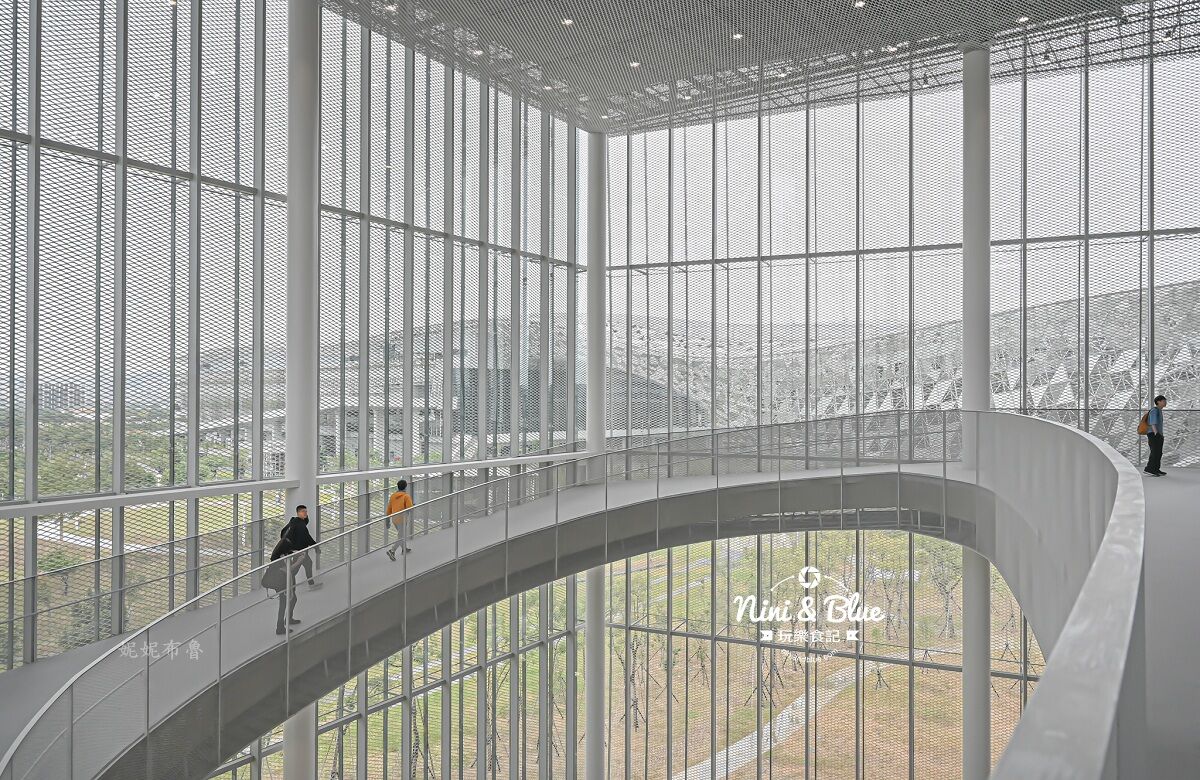 台中綠美圖的文化之森是一座從地面延伸至空中的半戶外屋頂花園,透過環形天橋連結美術館與圖書館,體驗藝術與自然共生的設計理念,下雨天不開放。