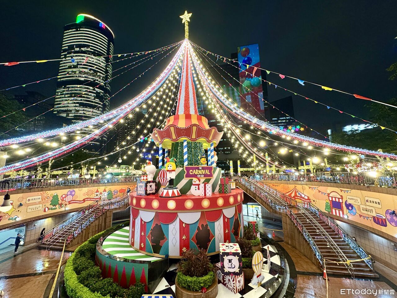 板橋車站B1連通道設置「LINE FRIENDS星光大道」,熊大、莎莉、雷納德點綴其中;縣民大道、新站路、新府路人行道也分別布置大象轉轉球燈飾、小丑派對與馬戲棚大道,處處洋溢節慶氛圍。