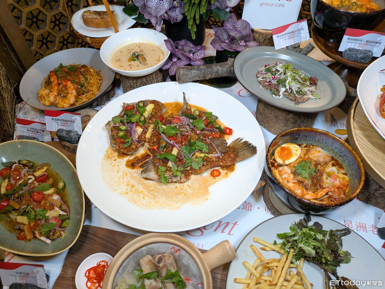 其他菜色還有結合花生醬與東方香料的炭烤沙嗲羊排、以鳳梨與辣椒堆疊出酸香辣韻的娘惹酸甜椒醬酥炸海魚、貢布白胡椒燉煮排骨的新加坡肉骨茶等。
