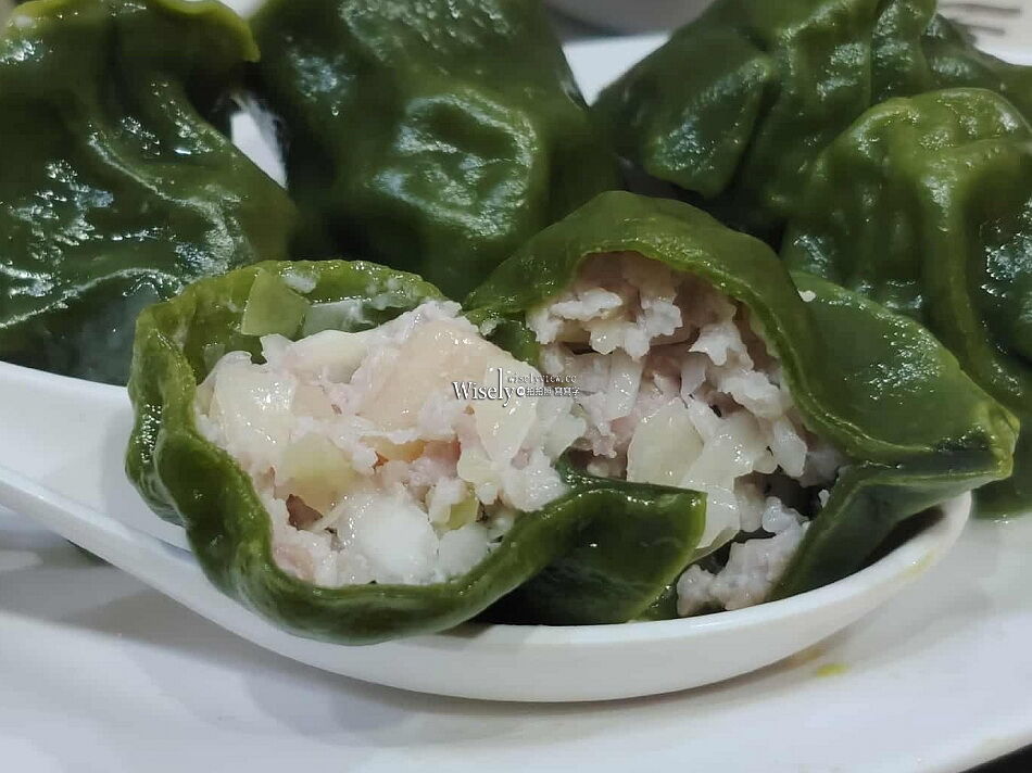 出名的干貝水餃採用綠藻皮去製作,以前採訪「Hi-Q鱻食」時,也是運用褐藻製作料理,但內容沒有水餃這個品項,不過我有吃過菠菜餃皮的。內餡主要為豬肉、高麗菜和干貝,但我覺得裡頭的干貝,應該是類似珍珠貝的食材,以單價一顆9元來看並不貴,只是我還是偏愛傳統像蝦仁水餃的內容多些。