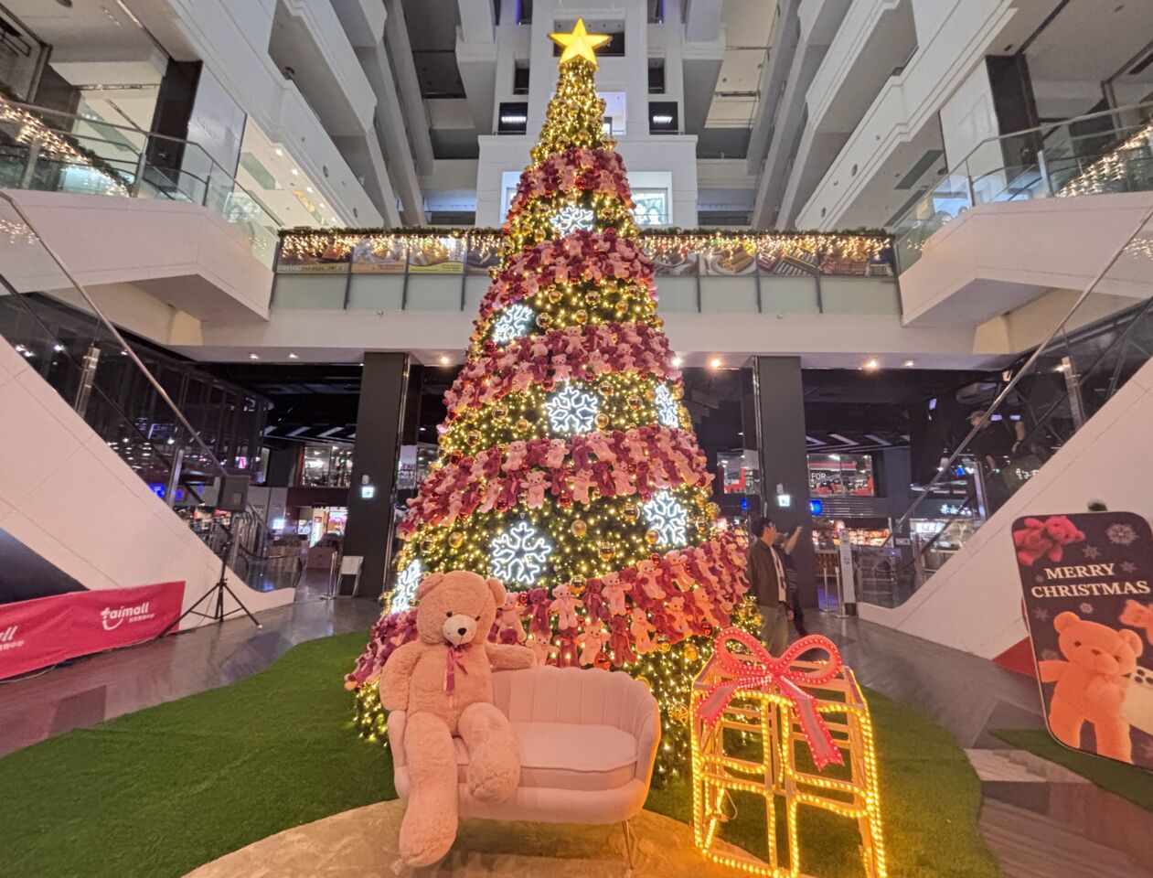 ▲▼8公尺高聖誕樹從B2一路延伸至中庭,樹前設有粉紅沙發與180公分的粉紅熊,成為民眾打卡點。