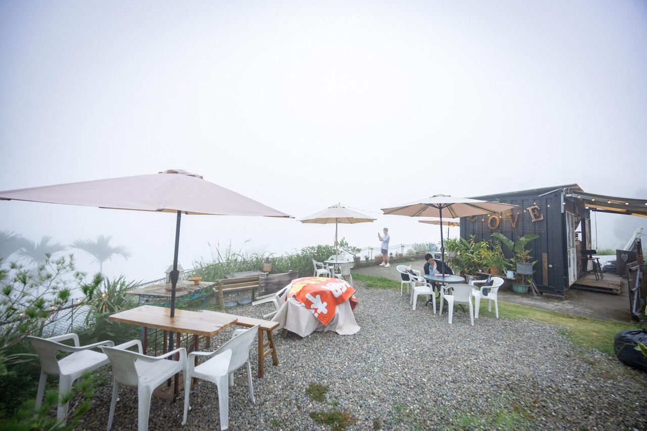 木質平台、綠植圍繞,加上開放式的設計,讓整個空間與山林景色融為一體。天氣晴朗時,可以遠眺綿延的山巒與層層雲海;不過這一次造訪時,剛好遇上山區起霧,整片視野都被柔白的霧氣包圍。