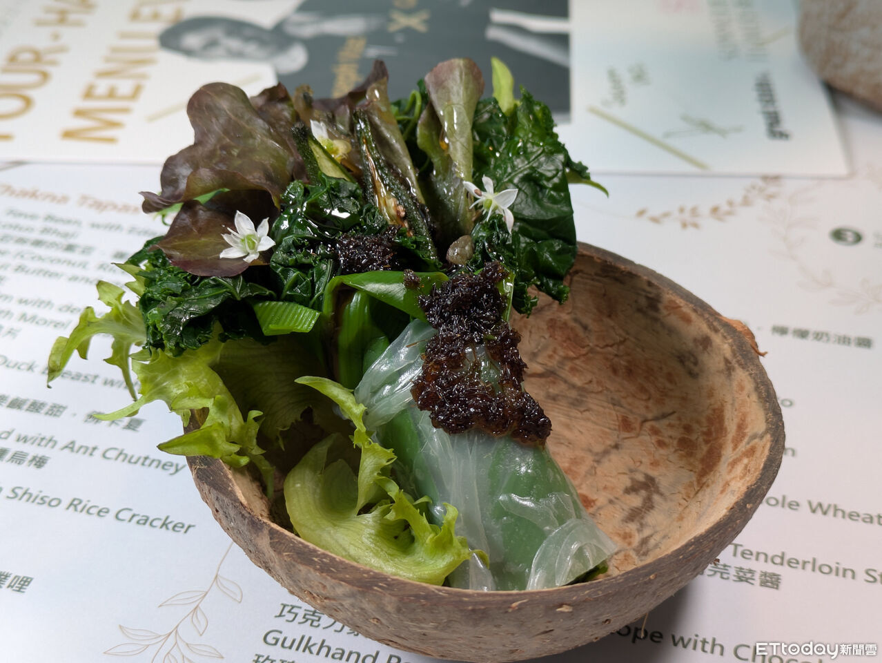 ▲「野菜沙拉」不只使用台灣山蘇、川七等山林野菜,其靈魂更來自於主廚特製的「螞蟻醬」。