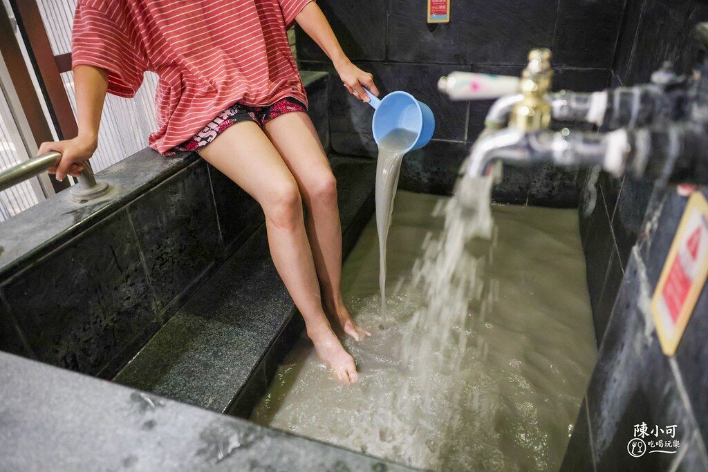 有冷熱兩個開關,熱的是泥漿溫泉、冷的是冷泉,泥漿溫泉溫度高,可以加冷泉水調節溫度。泡湯時可以感受到腳底有泥巴顆粒,記得小時候都會抹在身上或臉上敷臉,哈!泡湯池旁邊還有設置蓮蓬頭供沖洗,夏天泡完溫泉再沖冷水,冷熱交替也好棒。