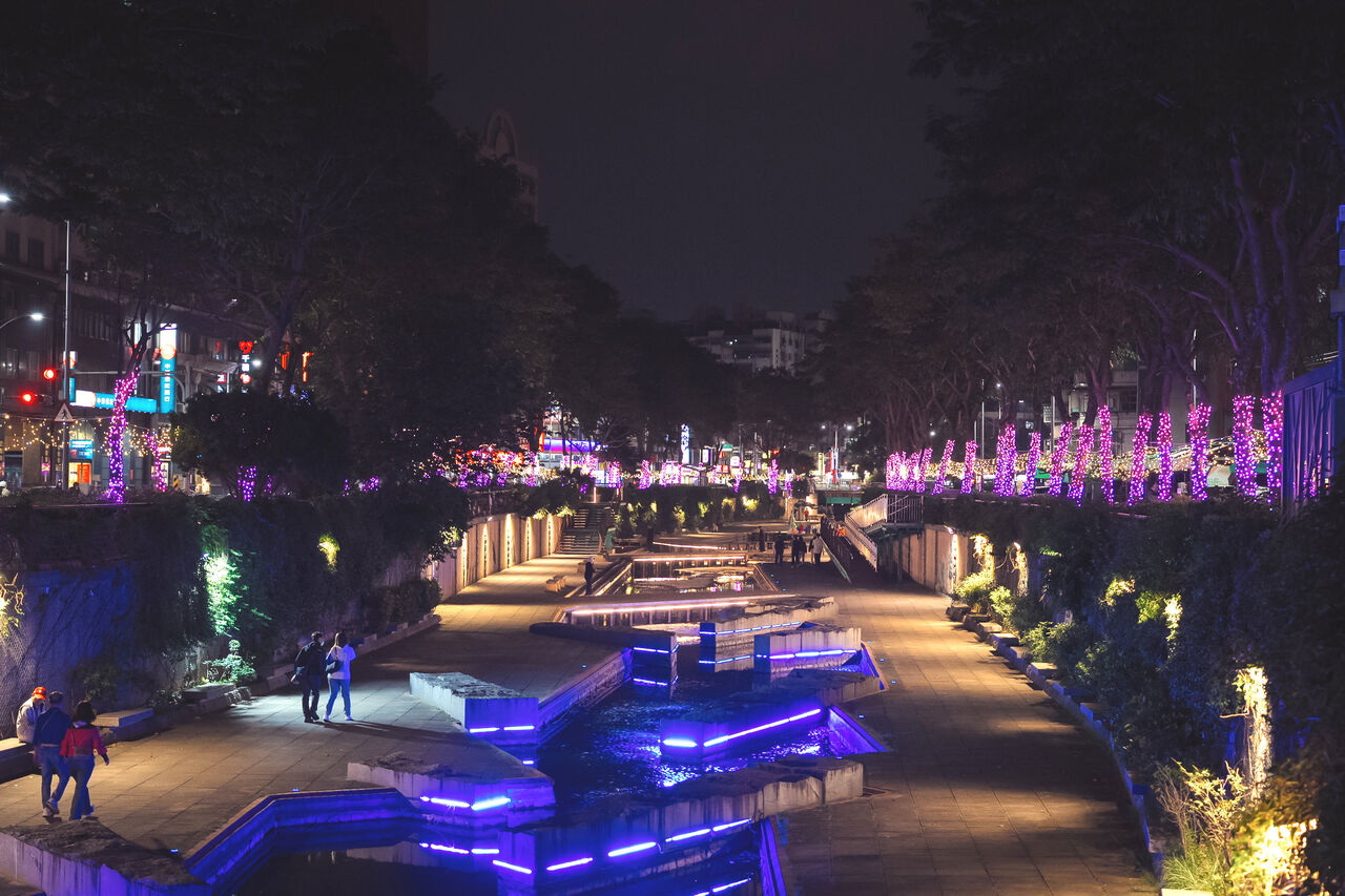 在擺脫臭水溝之名後,「中港大排」每年12月和3月皆舉辦燈展,今年從自立街至中央路兩側人行道上,掛設淺粉色、深紫色燈串,呈現自然漸層光影,另於中港廣場河廊下方,設置雲朵造型聖誕相框,洋溢幸福氛圍。