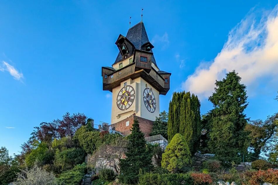格拉茲鐘樓有蠻多故事的,目前的塔樓大約於1560年落成,上面的木造建築曾是消防隊用來監控市區是否發生火災的瞭望點。目前的時鐘是18世紀的產物,一開始只有時針,後來才加上分針,所以兩者位置看起來怪怪的。既然是鐘樓,重要任務就是報時,如果有人被處決或者宵禁時間到的時候也會敲鐘。