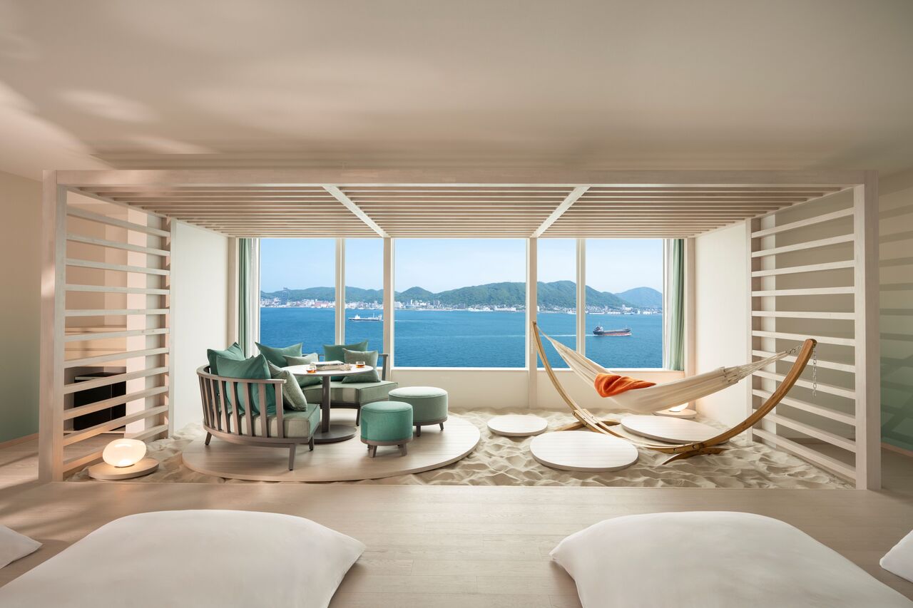 其中,「海峽Cabana套房」設有從客廳延伸出的「室內沙灘」,並提供「海峽Cabana BOX」,內含望遠鏡與貝殼,讓旅客親手觸摸、聆聽海聲或遠眺海景,打造專屬度假氛圍。
