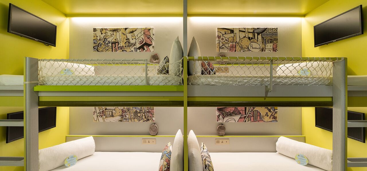 華山四人房採上下舖設計,空間融入金庫門把、支票造型便箋、復古電話與金色杯具等細節,重現銀行元素與1950年代懷舊氛圍,每張床位皆配置獨立影音設備,沉浸式體驗「在金庫住一晚」的特殊氛圍。