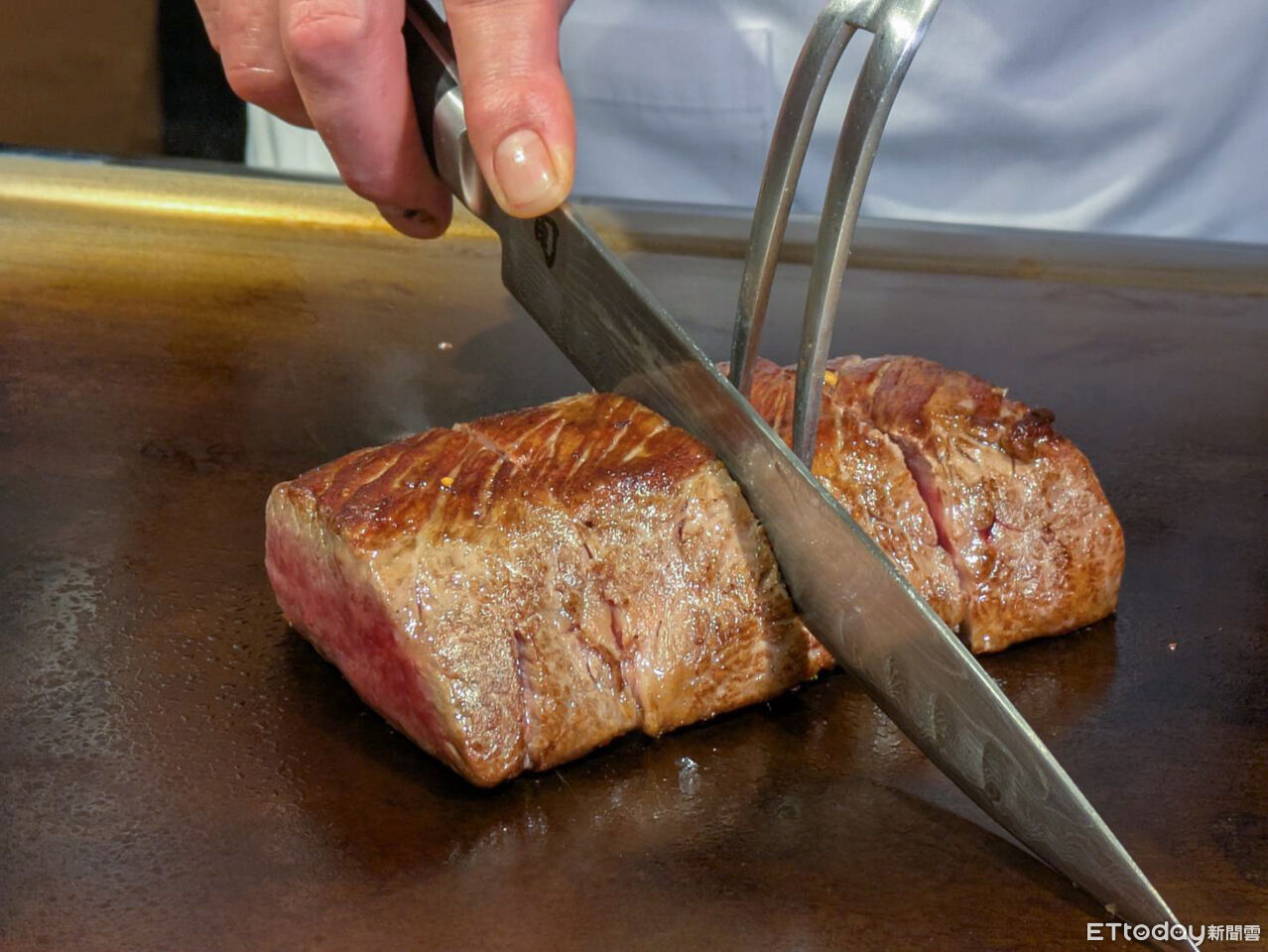 主餐牛排使用肋眼部位,師傅先在鐵板上香煎,經過一次靜置處理後,切片後進行二度香煎,接著切塊盛盤給客人享用。另可加價200元升級菲力,體驗截然不同的柔嫩質地。和牛叉燒飯與清燉牛肉湯則採內腿、牛筋兩種部位,將牛肉風味由主菜延伸至收尾。