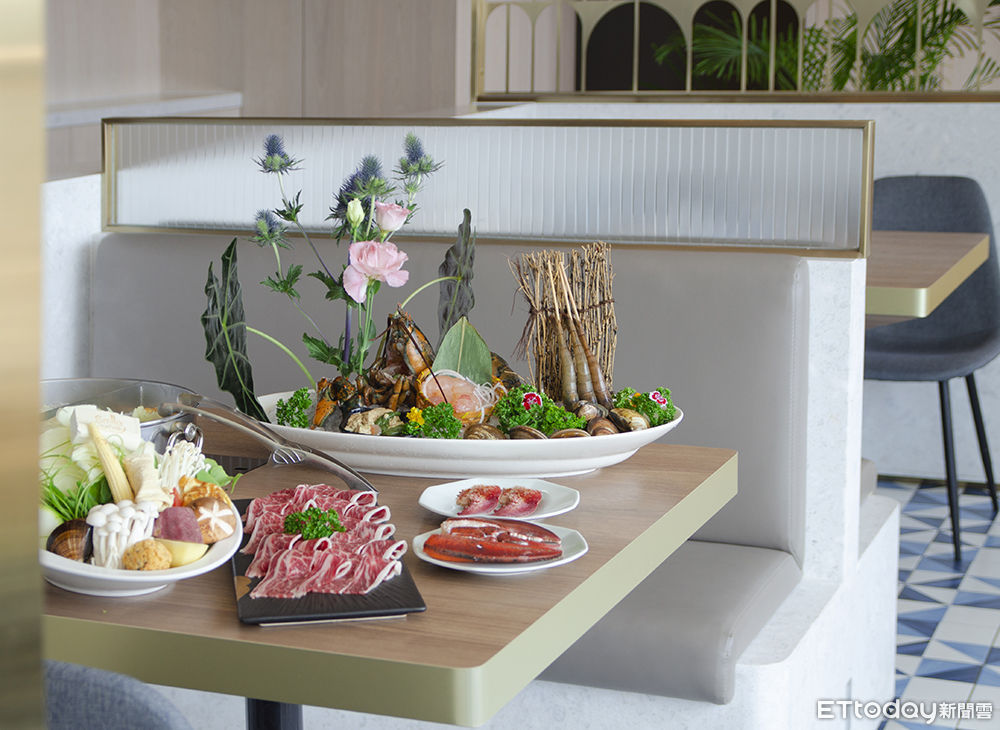 雙人龍蝦鍋內含波士頓龍蝦、特大蛤、龍虎斑、天使紅蝦及牛五花或梅花豬等豐盛食材,原價為3799元+10%。