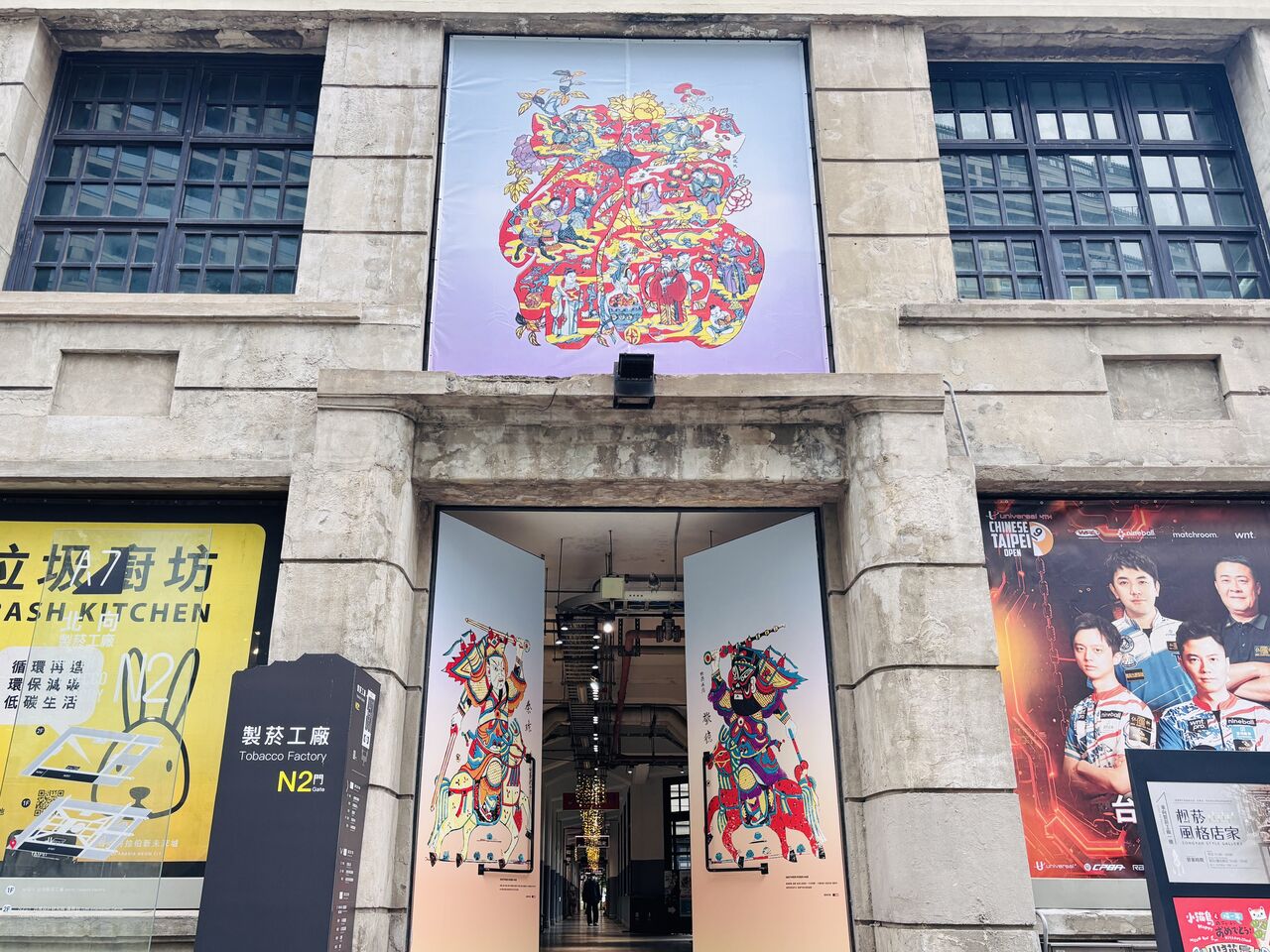 製菸工廠象徵守護園區的「四大門神」,除了威武形象,也融入拙趣可愛的農民畫風格;文創大街則設置多幅「百馬賀年」與「吉祥語馬圖」剪紙窗框,呈現團聚與祝福意象。
