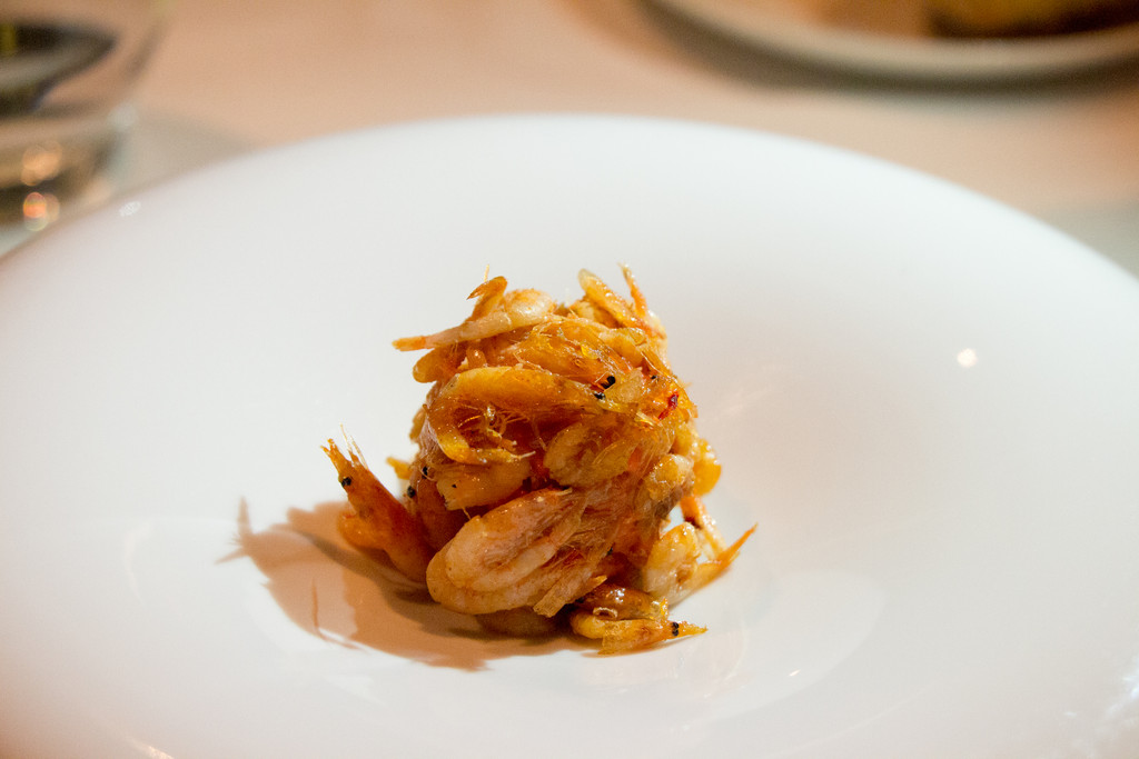 主廚希望顛覆傳統印象,將當季櫻花蝦製成冰淇淋。外層是香煎過的酥脆櫻花蝦,包裹著冰櫻花蝦泥,口感特別,口味沁涼。