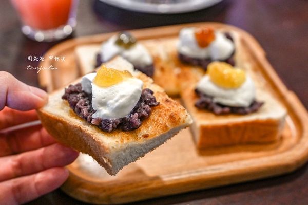 果醬為店家自製,每天供應的口味會隨機更換,這天來的時候是抹茶香蕉、鳳梨、橘子、蔓越莓,帶顆粒的小倉紅豆,有著滿滿豆香、完全不會甜膩,鮮奶油的風味也很輕柔,與店家自製果醬結合在一起,竟然能完美發揮加分效果,多了水果香甜感的紅豆吐司變得更好吃了,四種口味吃完心裡無比滿足,真要說缺點的話,就是份量較為精緻。