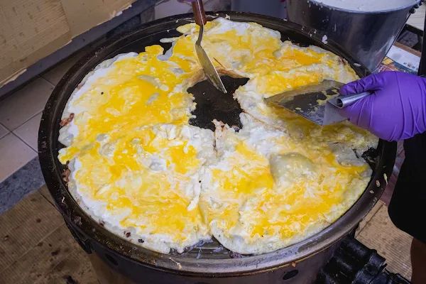 安和路無名古早味蛋餅料理過程不假他人之手,從粉漿、香煎到分切皆由店內師傅所製作,有別於傳統蛋餅僅以麵粉為底,這裡的粉漿還有加入磨過的米漿與高麗菜,淋上煎台定型後,會在打上雞蛋香煎;起鍋後會再依照點的份量分切,淋上不同的醬料。