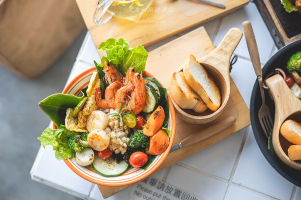 貼心的就是,丹桂小菊連素食者的味蕾也顧到了,推出了這款「小蔬食」,有各種生菜還有更多樣的在地小農的時蔬,如果是吃蛋奶素或是五辛素的旅人,就可以選這一款,另外在沙拉中都會附上香煎麵包,口感上外酥內軟,還帶有淡淡的香氣。