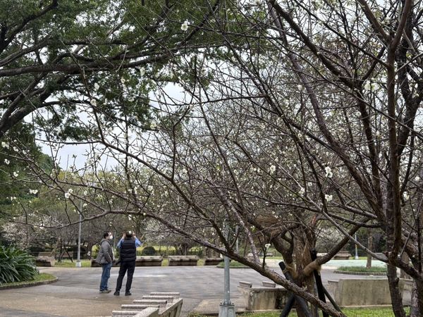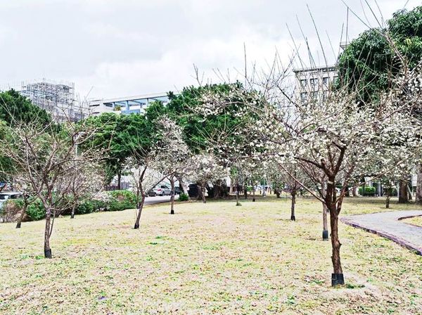 ▲萬華區的青年公園民間劇場前,種植約20株白梅花,目前開5成。(圖/公園處提供,下同)
