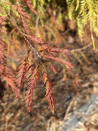 台南市觀旅局表示,六甲菁埔埤的落羽松鄰近日式木造建築的林鳳營車站,受到幾波冷氣團的影響,六甲落羽松已逐漸轉紅,沿著環埤步道漫步欣賞落羽松森林美景,層層疊疊的豐富色彩及倒映於水面上的倒影,優美畫面彷彿置身仙境。