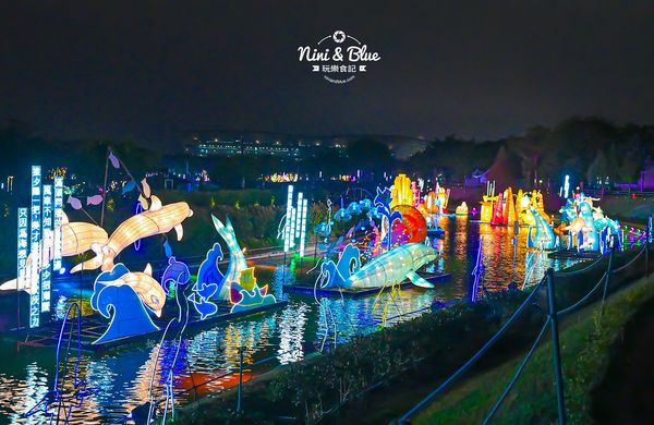 ▲河道水岸布置相當多組大型燈劇組,鯨豚自在優游其中。