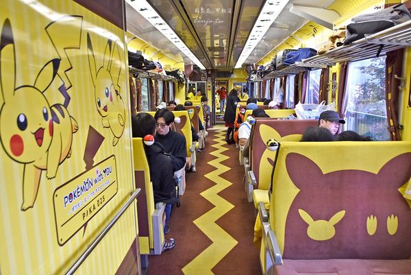 進站前大家就在歡呼,因為真的非常可愛,從遠方駛來就像個巨星一樣,外觀有著滿滿皮卡丘,進入車廂一看更是不得了!