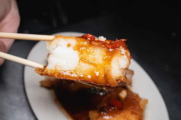 宵夜開賣的蘿蔔糕每日有限,現點現煎還來不及,滿滿一整排紙盒在排隊,外皮煎得金黃酥脆,裡頭綿密飽滿而滑潤,大口咬下相當有扎實感,不油膩且飽滿濕潤度,加上特製蒜醬汁相當滿足,加點辣椒醬更有味道,更襯托出蘿蔔的甘味。