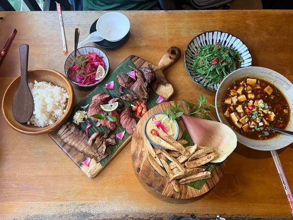 嘉義美食「Hana廚房」的店主夫婦分別為鄒族和南非裔,因此他們家的披薩和手工麵包融合了一股異國風味,而這裡必吃的餐點有烤肉盤和披薩,而烤肉盤包含香腸和山豬肉,搭配生菜和麵包等食材,看起來豪華又份量十足!另外,店家環境乾淨又清幽,且大量的木造家具與植栽,巧妙地與周邊山林融為一體,整體氛圍營造得很棒。