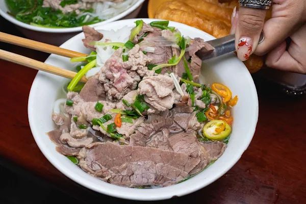 供應越南河粉,有三種不同部位的牛肉,分別是phở tái nạm(半生熟牛加牛腹脅肉片)、phở tái(後腿肉/生)和 phở chín(牛腩/熟),也可以加蛋、油條,提供簡單中文與英文點餐服務。