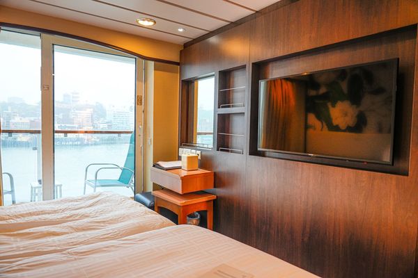 衣櫃有提供浴袍、衣架、保險櫃跟救生衣,衛浴空間採乾溼分離,每天也都有房務人員會來打掃,廁所跟飛機一樣是採真空吸取式馬桶,蓋上蓋子之後的沖水聲比較大聲。