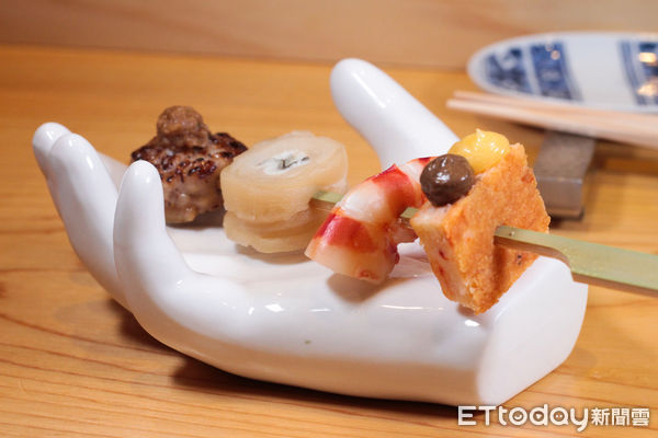 「軟絲糰子照燒醬.乾瓢卷長崎縣白燒星鰻煮.台灣東港小明蝦.櫻花蝦蛋糕」則是看得到串燒的影子,依序分別使用是外層微煎至香的宜蘭軟絲丸、包裹於乾瓢卷中的白燒星鰻、以柴魚與昆布高湯輕煮的東港產小明蝦、融合東港櫻花蝦與西式帕瑪森起司的櫻花蝦蛋糕。
