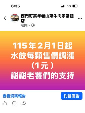 ▲老山東牛肉家常麵店日前公告2月1日起水餃漲1元。(圖/取自西門町萬年老山東牛肉家常麵店臉書)