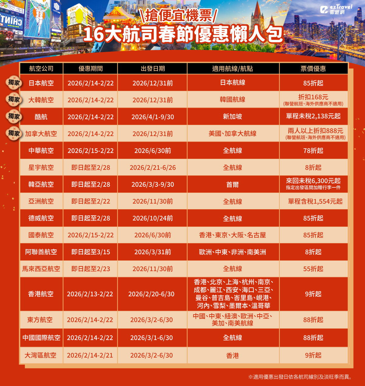 各大航空公司持續推出促銷,易遊網整理16家航空「春節優惠」,航點遍及日韓、東南亞、港澳大陸及歐洲、紐澳與美加等地,票價最低下殺55折起,出發區間最晚至11月30日。其中,韓亞航空飛首爾來回未稅6,300元起;華航飛曼谷來回含稅7,386元起。